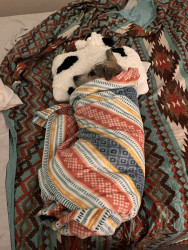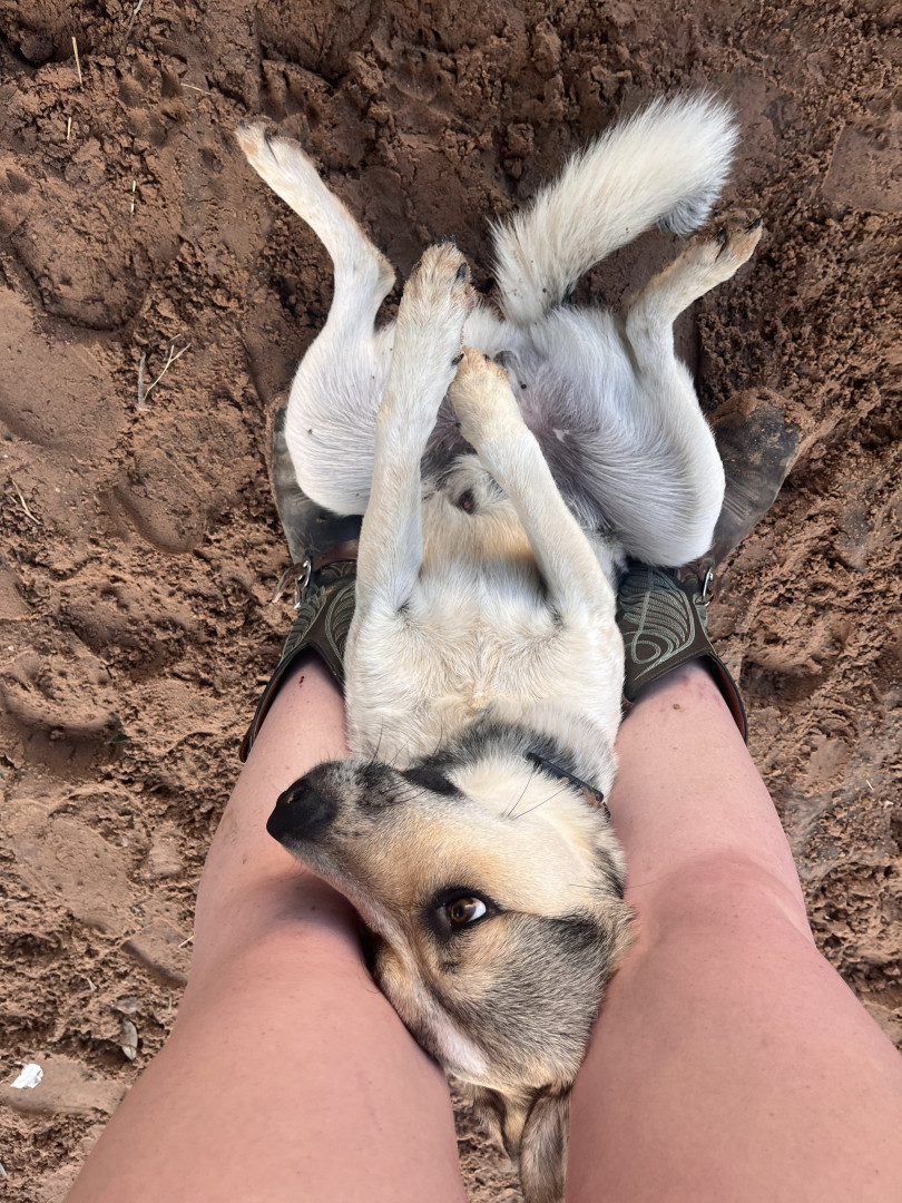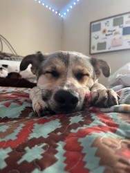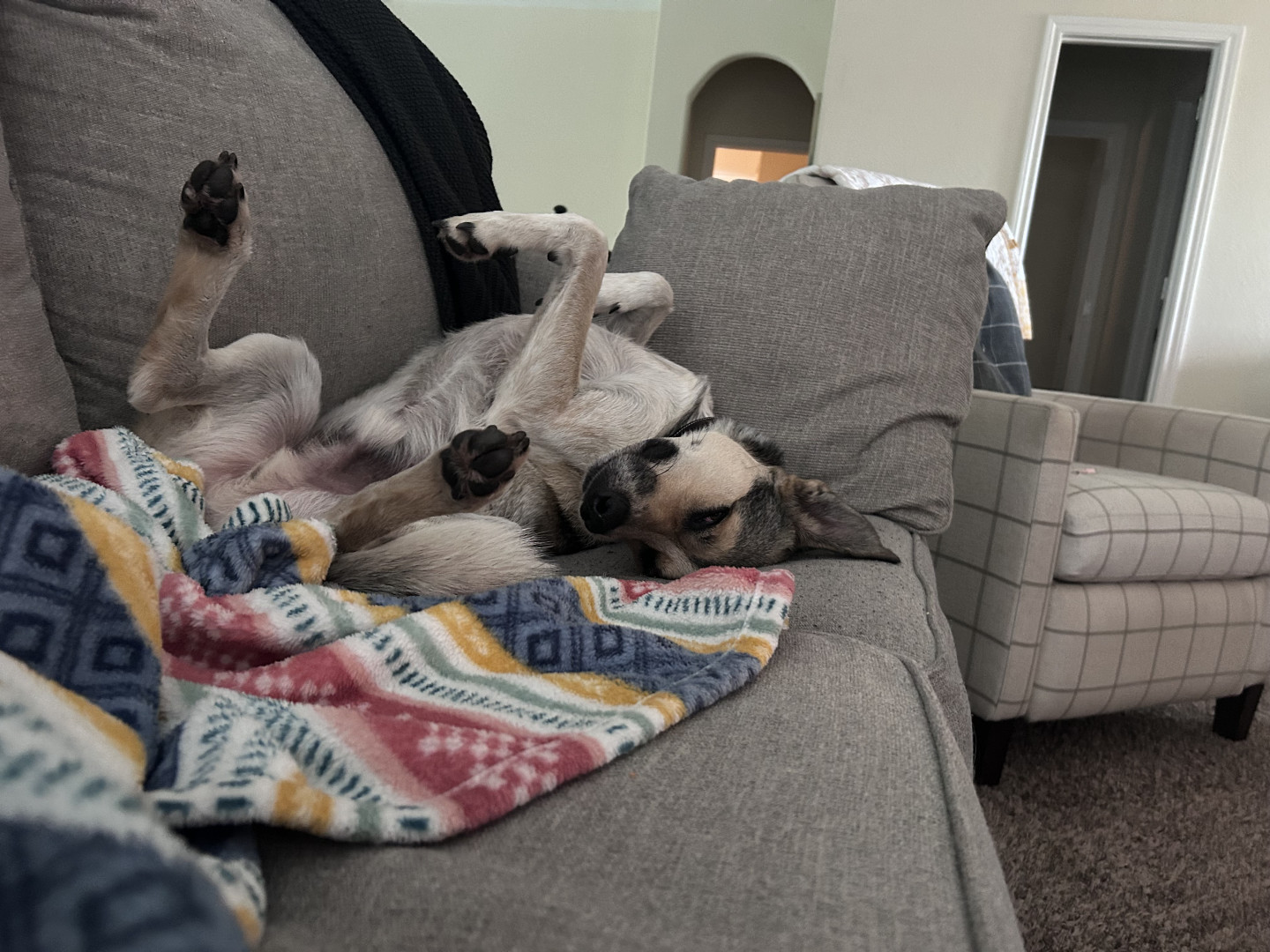 Wrangler's most unique quality is his facial expressions and sleeping habits. You will immediately know when you have hurt his feelings when you tell him he can't eat another piece of people food because his stomach will hurt, or when he is excited to see you and puts on his version of a goofy grin. His other unique quality is how he sleeps on his back with his legs in the air! He has done this since I rescued him when he was 8 weeks old, and he loves to lay and sleep like that! !