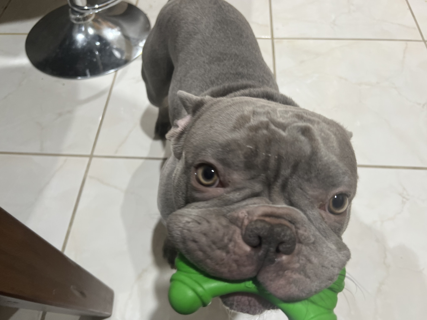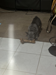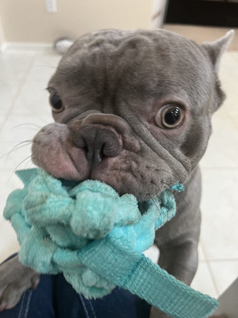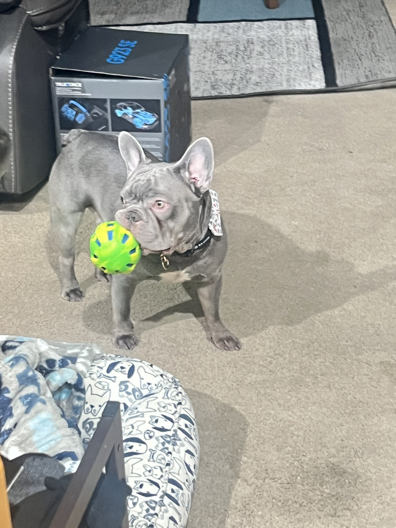 He favors his big orange soccer ball and his big bones. He loves big bones even though he's too small for them, he’ll chew on them for weeks. He loves playing with balls as if he was a little soccer player, he also loves basketballs and will push and kick them around. He’ll bring his ball over to you, to play what looks like soccer with him.