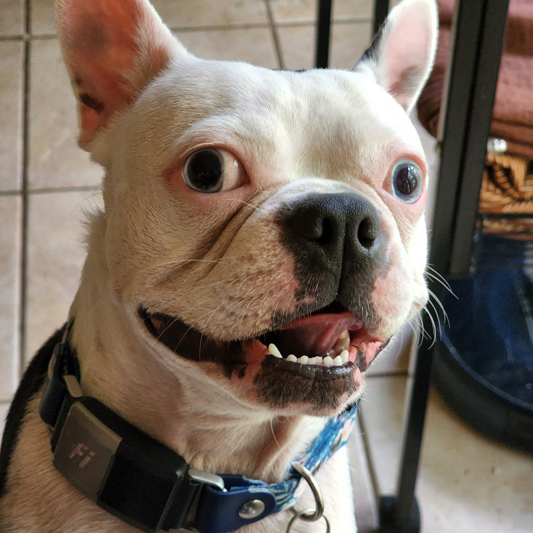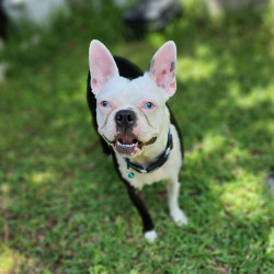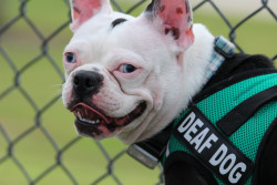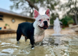 Yami Suke is a deaf Boston Terrier. She knows 21 words in sign language! She loves baths, pools & showers. She is part of a 5 Boston pack.