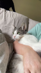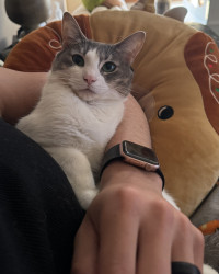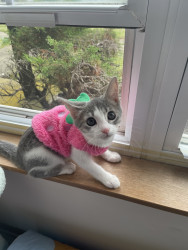 Yoda is a 2 year old DSH. She loves to play fetch with hair ties, follow her mom around, and eat chicken and whipped cream.