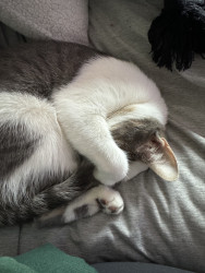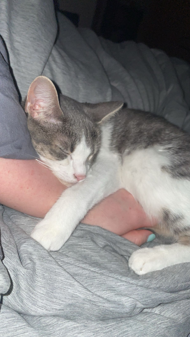 She is a tiny cat but can eat more than a dog. She loves food so much and knows exactly when it’s dinner time. She also loves to cuddle up with her mom under the blanket. She will try to grab the blanket herself and put her head under to sleep.