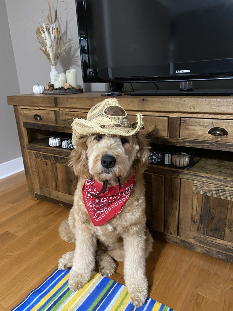 Yogi is a Goldendoodle that weighs 75lbs that thinks he’s a lap dog sweet and very sensitive. Loves to steal socks and run. Best boy ever!!!