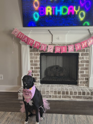 She’s a Staffy mix who’s always up for playing or hugging. She gives the best hugs and kisses! She is sweet and fun and loves kids.