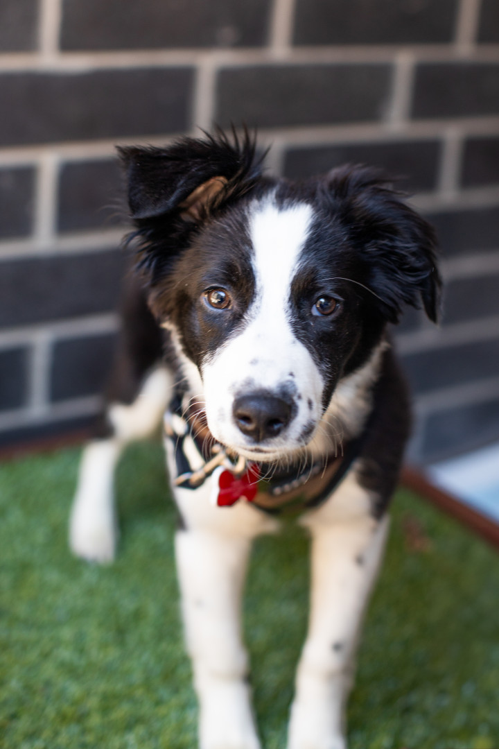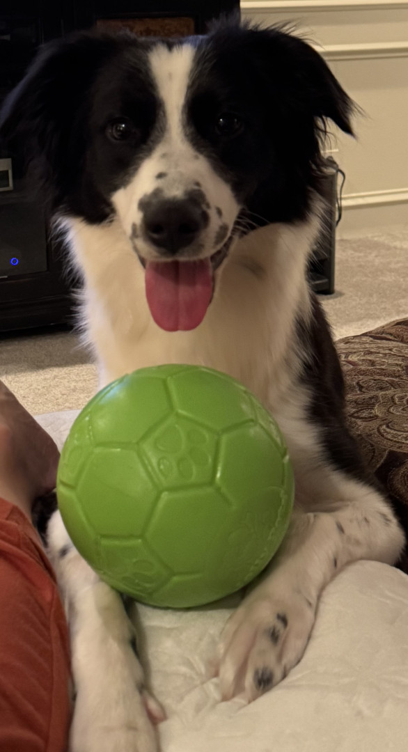 black-and-white bundle of joy, all bright eyes and big smiles, proudly guarding her neon-green ball like the world’s cutest teammate