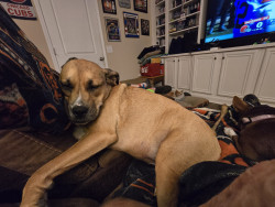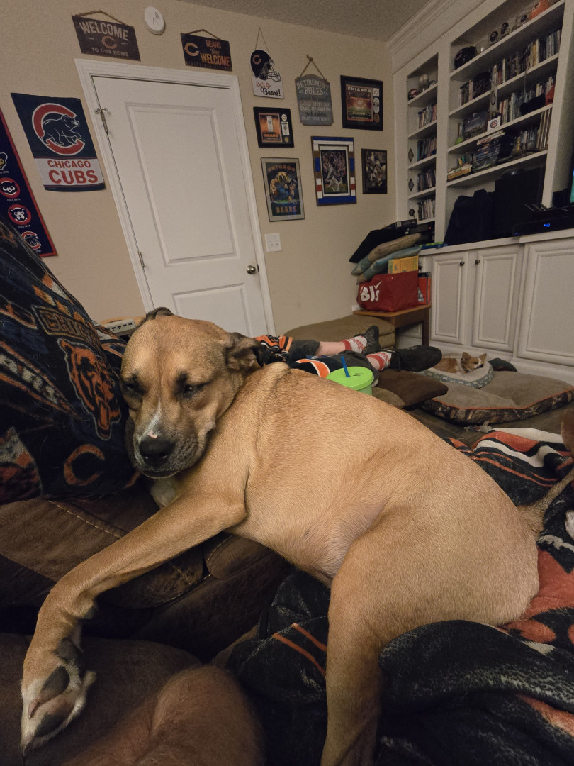 A mixed breed, sometimes showing a boxer underbite, and the biggest 'baby' (57 lbs).