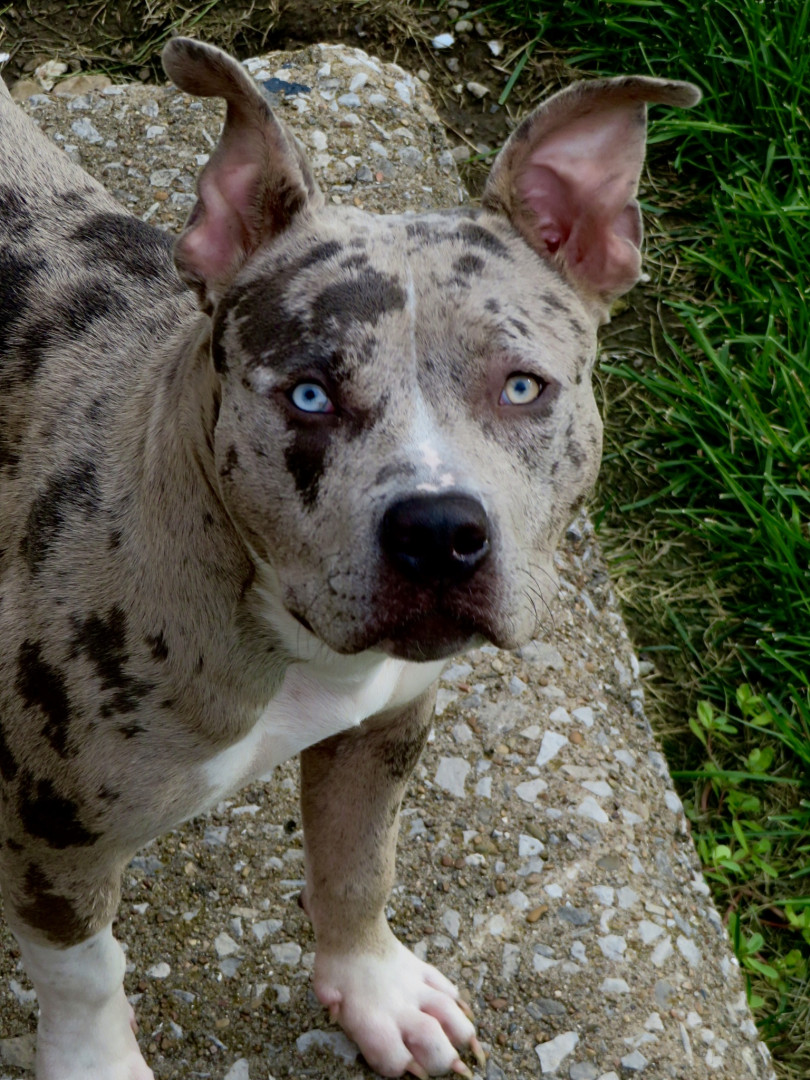Zena is a tri-merle with one blue eye and one green eye. She loves cuddles, outdoor play, and car rides for 7 Brew pup cups.
