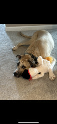 Learn MoreZeno goes CRAZY for his stuffed squeaky pirate chicken from Costco, specifically the white and red one! The gray or brown pirate chicken won’t do! So much so that we’ve stocked up and have a shelf dedicated to extra pirate chickens just in case he switches to ‘Zeno destroy mode’ and chews up his ‘best friend’. Zeno also LOVES Nubz treats and bully sticks!