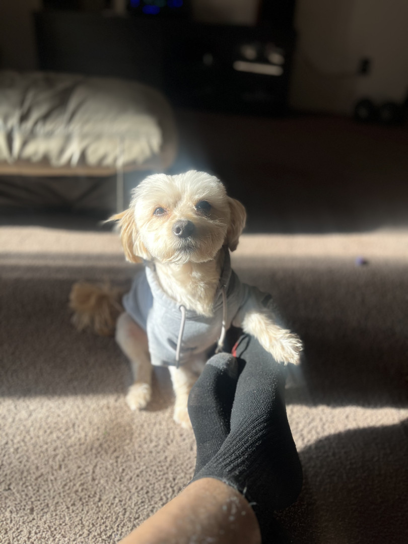 He is a unique mix breed, chihuahua and maltese, he thinks he’s a lap dog but hes just a little to heavy for that