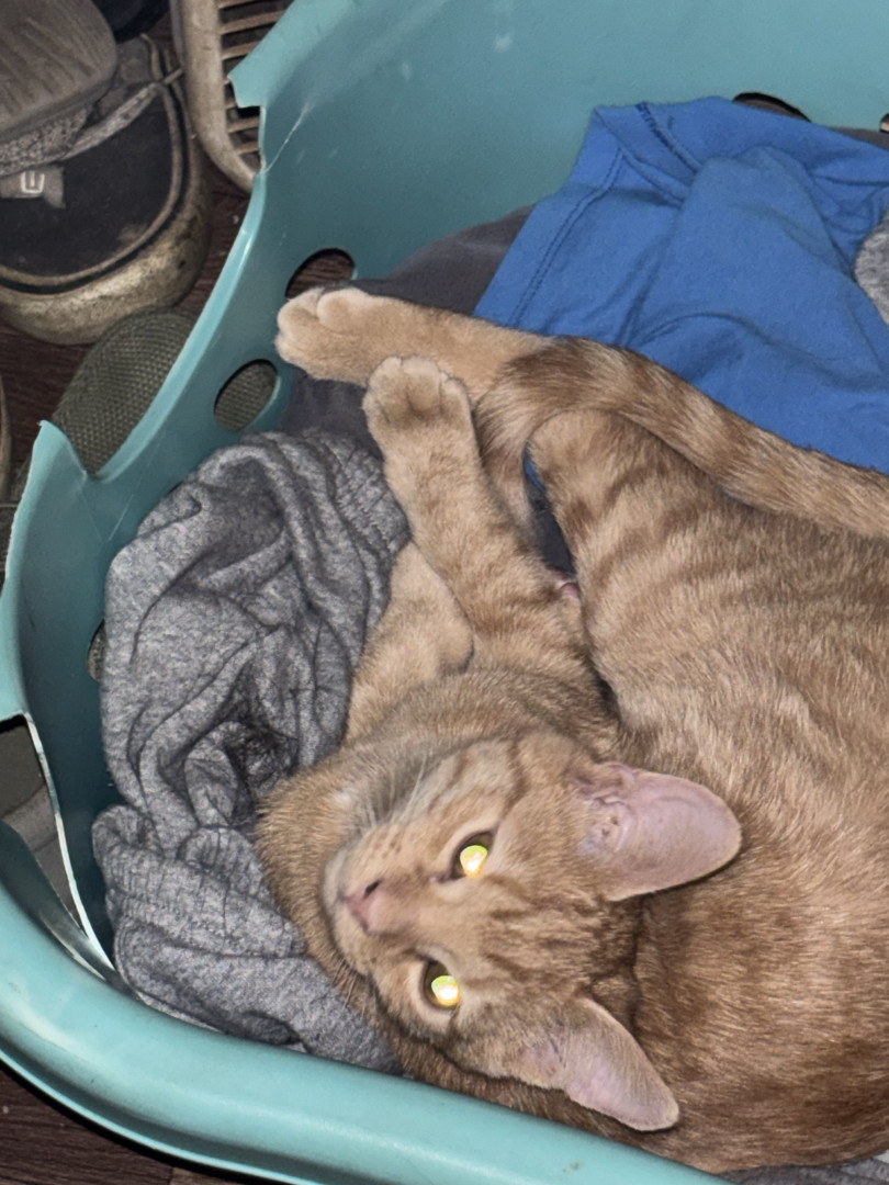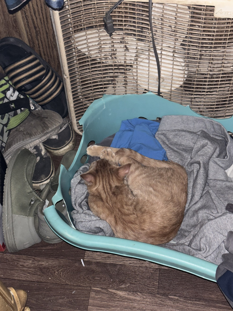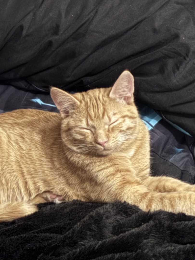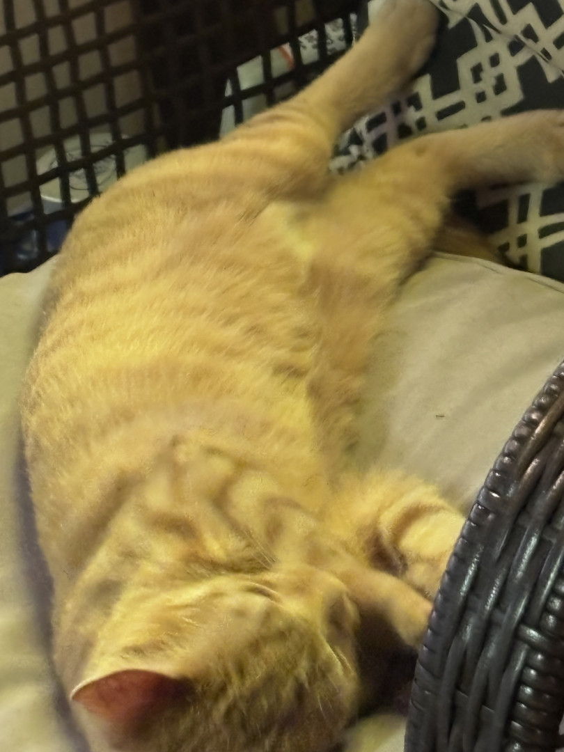 She was a rescue cat. I found her on a job site nothing but skin and bones. I had a pack of tuna in my bag. I opened it up. She went ham on it. I got her a little bowl of water for our orange cooler. You should’ve seen how she was taking all that in she hasn’t had any in a while so I wrapped her up in my flannel shirt and brought her home and ever since then nothing but a fat cat with a lot of love she loves doing tricks for treats