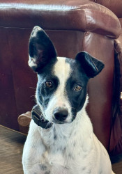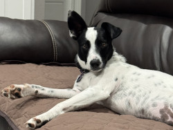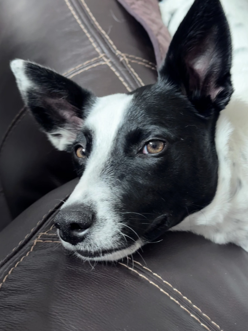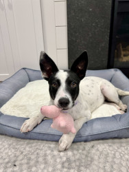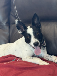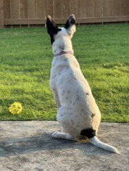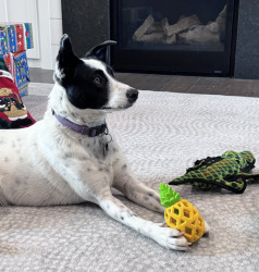 Shelter rescued. Australian Cattle Dog mix. Smart. Loves to go on walks. Stuffed chew toys don’t stand a chance with her.