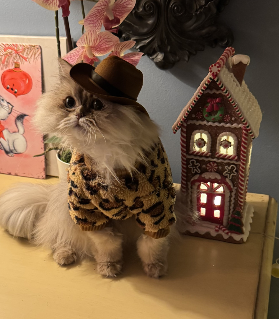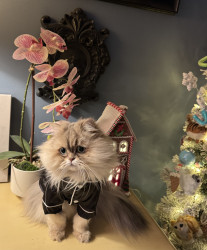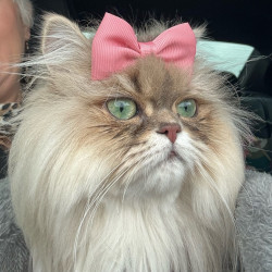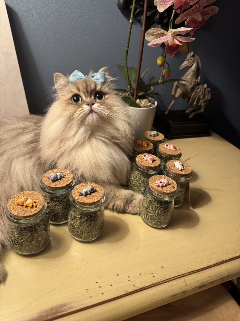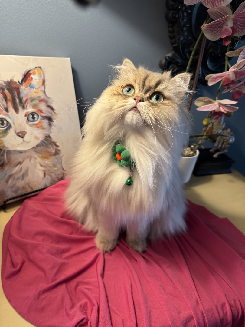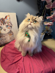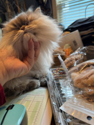 She is so chill and loving! She is a working feline, helping me run my pop-up designer cat shop called "Meow Wow"!
