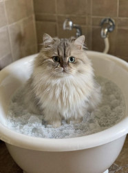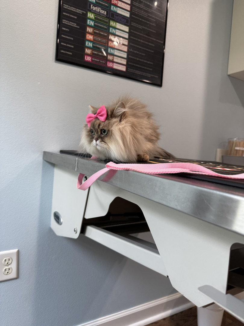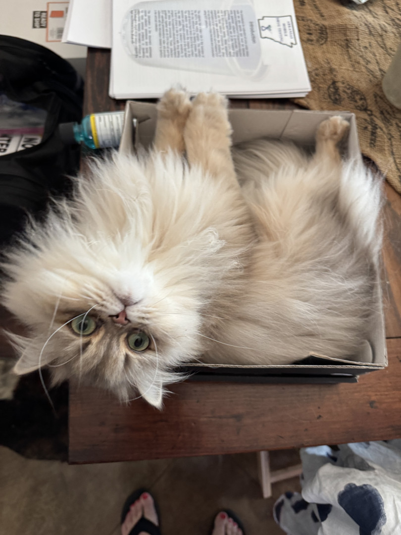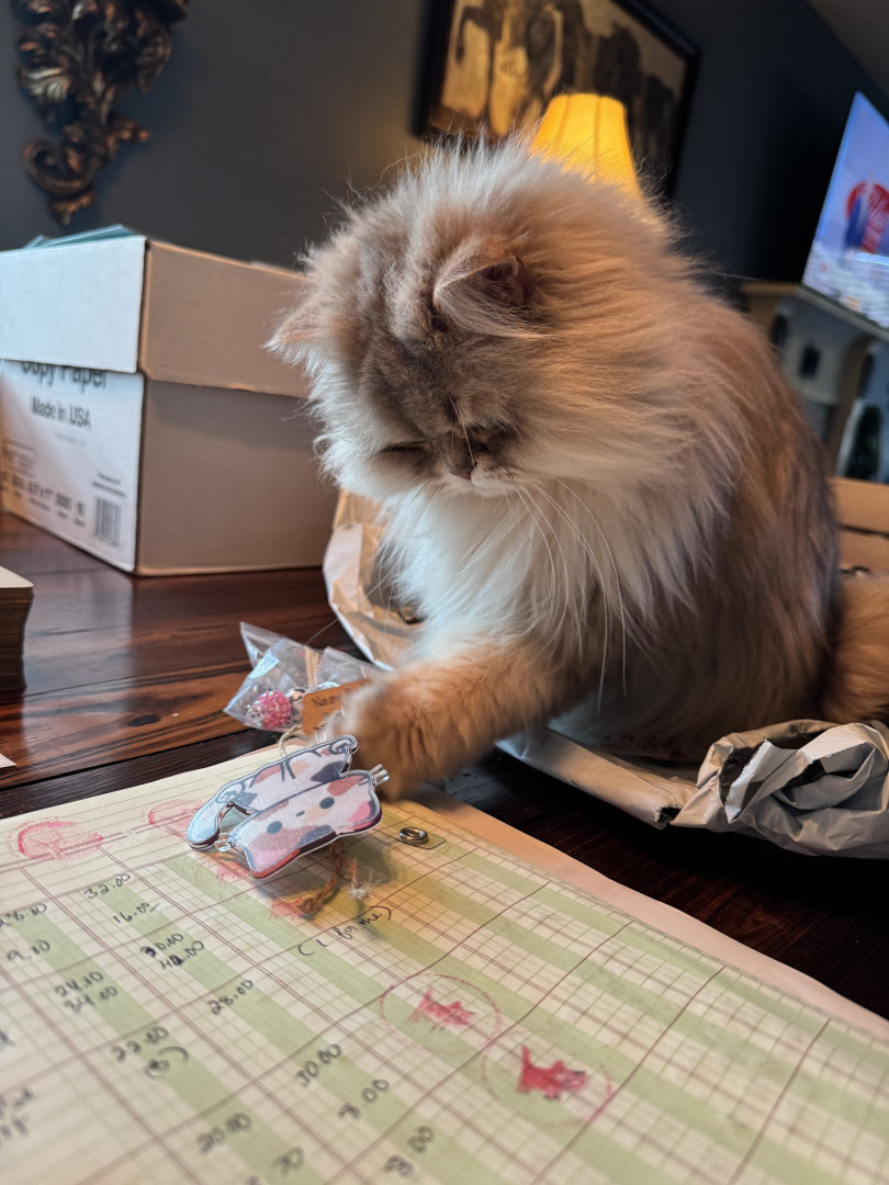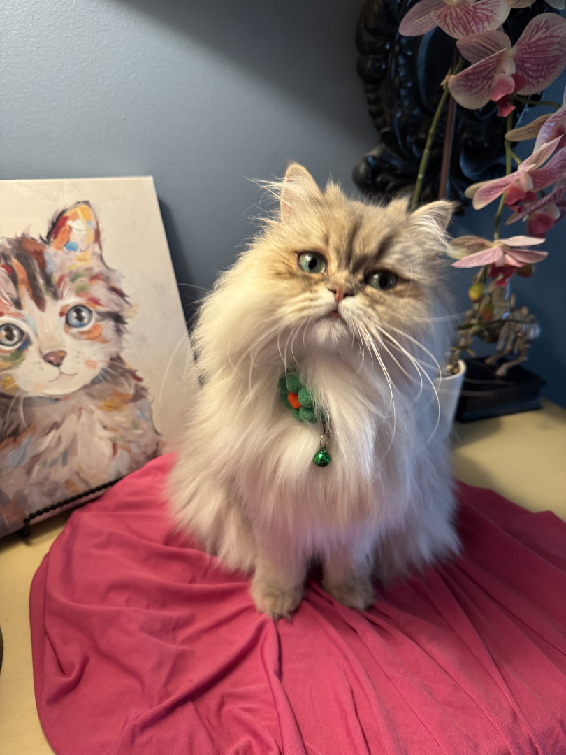 She is so chill and loving! She is a working feline, helping me run my pop-up designer cat shop called "Meow Wow"!