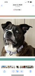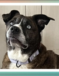 Zoe has one blue eye and one half blue and half brown eye, she is just looks as friendly as she is. She is the most loveable dog you could meet. When my grandson was a 1 1/2 he would pet her and try to sit on her and hug her and Zoe would just lay there and let him do whatever he wanted. Never moved or made a noise, would just try to lick him. And my dad loves when she visits his house, he sits on the edge of his chair waiting to pet her, and dad is not a pet person. Zoe can make anyone love her