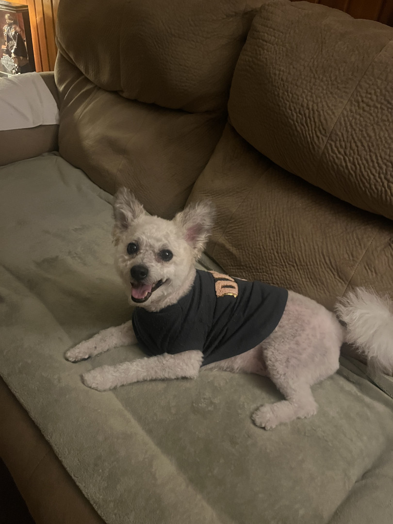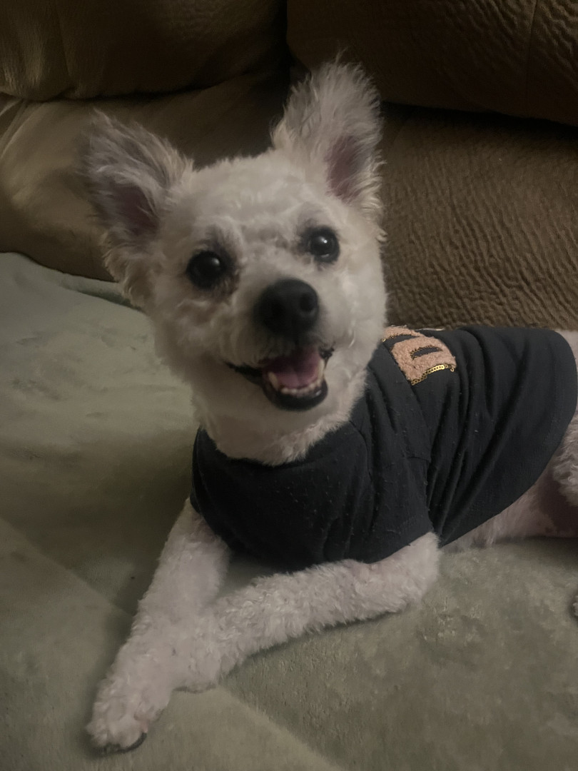 Zoe is a Yorkie poodle mix. She loves dressing up. She loves squeaky toys and chicken and lots of treats and belly rubs.