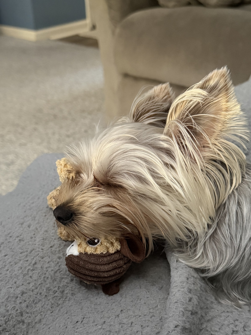 Receive Text UpdatesZoey "loves" to fetch her squeak toy! Of course we have multiple colors! Zoey has a "back-up" too, and that is a racquet ball. Chasing the ball down and bringing it back to me is a daily routine for fun and exercise. Zoey loves her beef sticks from Farmers Dog. A healthy treat that she looks forward to daily.